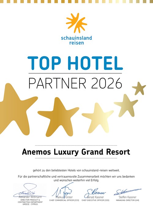 Anemos Luxury Grand Resort is a 5-star Luxury Suites and Spa Hotel located next to the village of Georgioupolis Chania at the northwestern part of the island of Crete, with a magnificent view of “Lefka Ori” and overlooking the Cretan Sea.